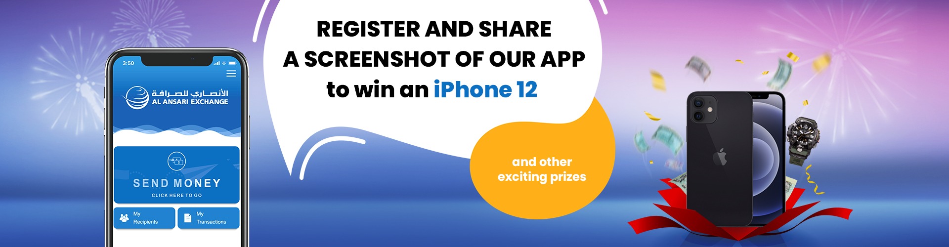 Register & Share a screenshot of Al Ansari Exchange App to Win an iPhone 12 and other exciting prizes.