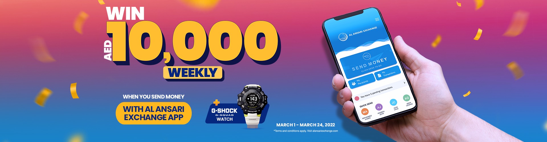 Send money through the Al Ansari Exchange Mobile App for a chance to win a AED 10,000 and Casio G-SQUAD watch every week.
