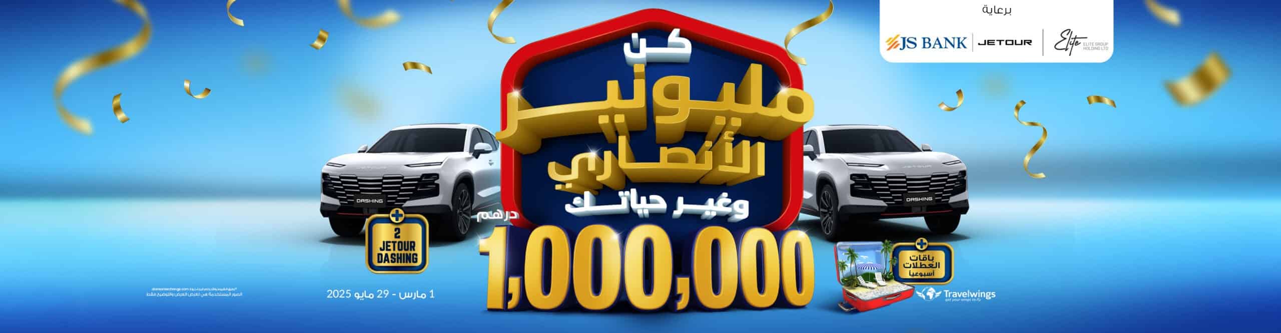 نعم، إنها فرصتك الآن لربـح جائزة 1,000,000 درهم نقـداً بـالإضافة إلى باقـات عطلات مميزة من Travelwings أسبـوعياً عند إجراء معاملة مؤهلة من خلال تطبيقــنا أو فروعنا. كما يمكنك الدخول في سحب إضافي لربح سيارتي Jetour Dashing بـمجرد إجراء معاملة مؤهلة ثانية.