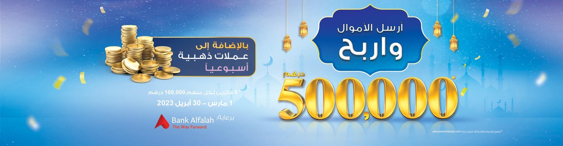 هذه هي فرصتك لتكون أحد الرابحين بجوائز تصل إلى 500,000 درهم نقداً أو عملات ذهبية أسبوعياً عند إرسال الأموال عبر تطبيق الأنصاري للصرافة أو لدى أي من الفروع أو عند إجراء أي من المعاملات المؤهلة.