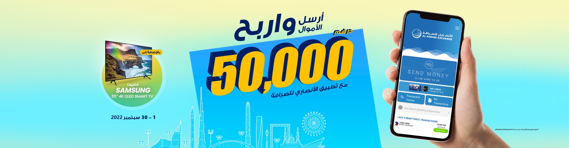 أرسل الأموال عبر تطبيق الأنصاري للصرافة للحصول على فرصة الفوز بـ 50,000 درهم نقداً بالإضافة إلى تلفزيون Samsung 55” 4K QLED Smart TV.