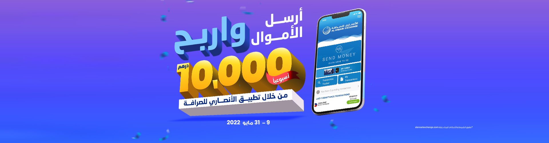 أرسل الأموال عبر تطبيق الأنصاري للصرافة للحصول على فرصة الفوز بـ 10,000 درهم نقداً أسبوعياً.