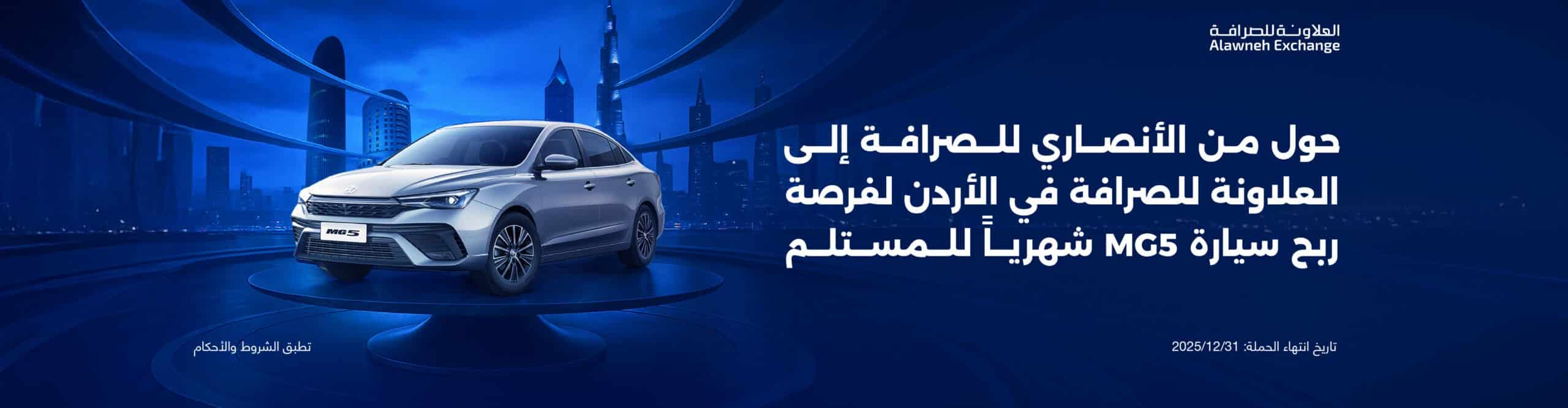 أرسل الأموال من الأنصاري للصرافة إلى العلاونة للصرافة في الأردن لفرصة لربح سيارة MG5 شهرياً للمستلم!