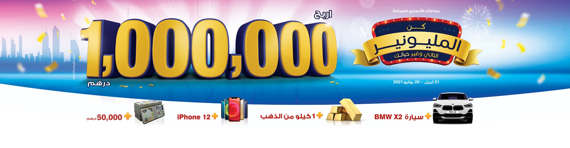 - للدخول في سحوبات جائزة المليون درهم و آيفون 12 و10,000 درهم: يتوجب تحويل الأموال عبر تطبيق الأنصاري للصرافة أو لدى أي من فروع الأنصاري للصرافة في الدولة أو إجراء أي من المعاملات المؤهِلة.