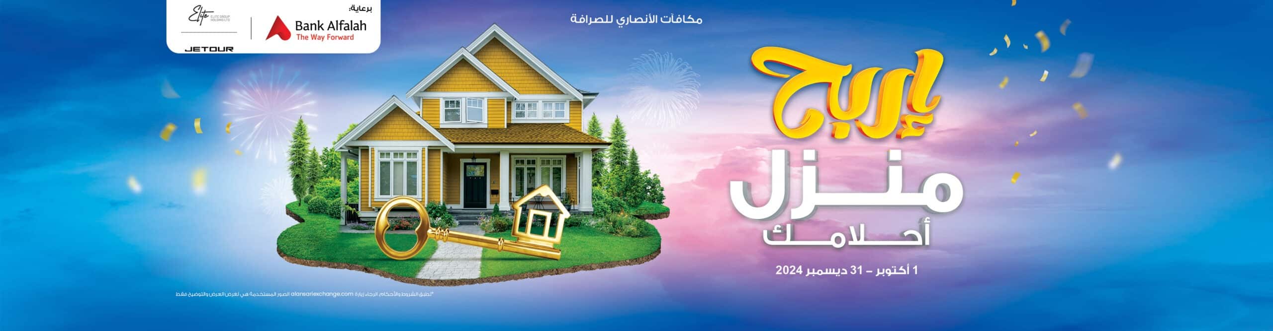 مع كل معاملة مُؤهلة تقوم بها مع الأنصاري للصرافة، أنت أقرب إلى الفوز بالمنزل الذي طالما حلمت به بالإضافة إلى باقات العطلات مميزة أسبوعياً. كما يمكنك الدخول في سحب إضافي لربح سيارة Jetour T2 بمجرد إجراء معاملة مؤهلة ثانية.