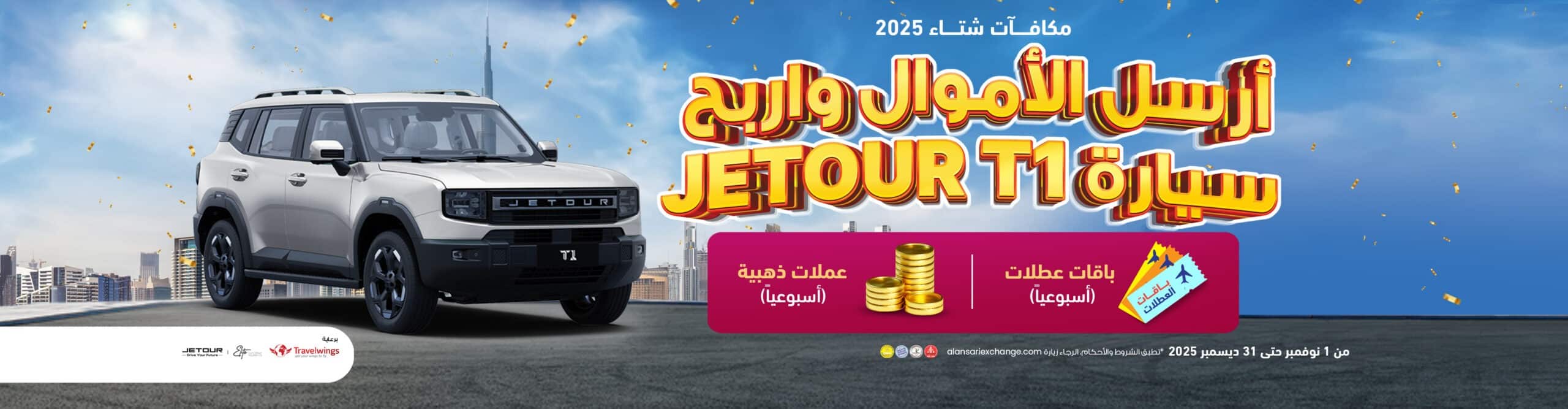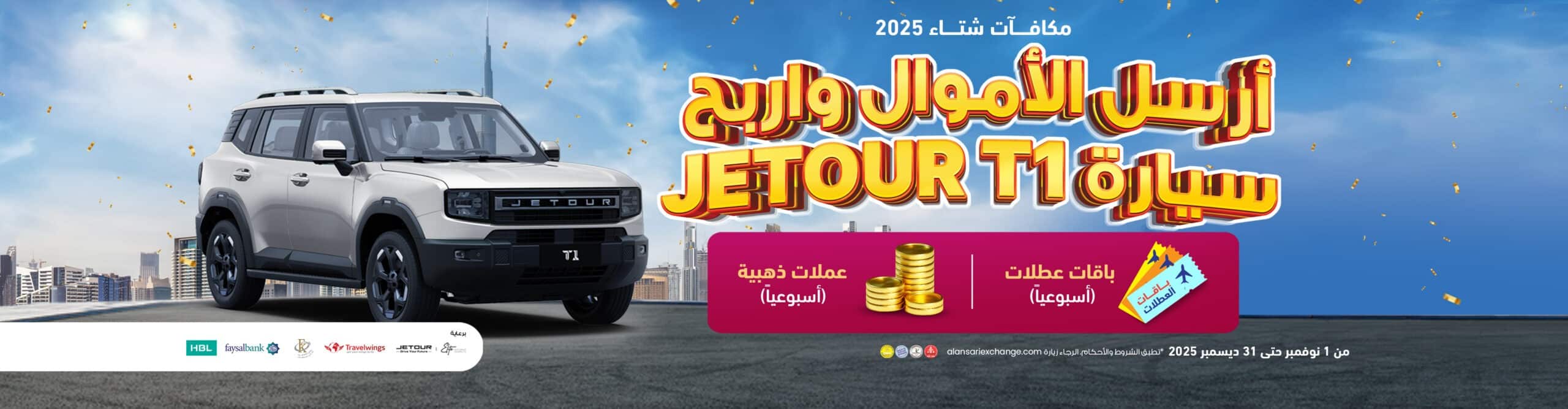 أرسل الأموال من خلال تطبيق الأنصاري للصرافة أو فروعنا أو قم بأي معاملة مؤهلة، واحصل على فرصة لربح سيارة Jetour T1، بالإضافة إلى عملات ذهبية وباقات عطلات مميزة من Travelwings أسبـوعياً