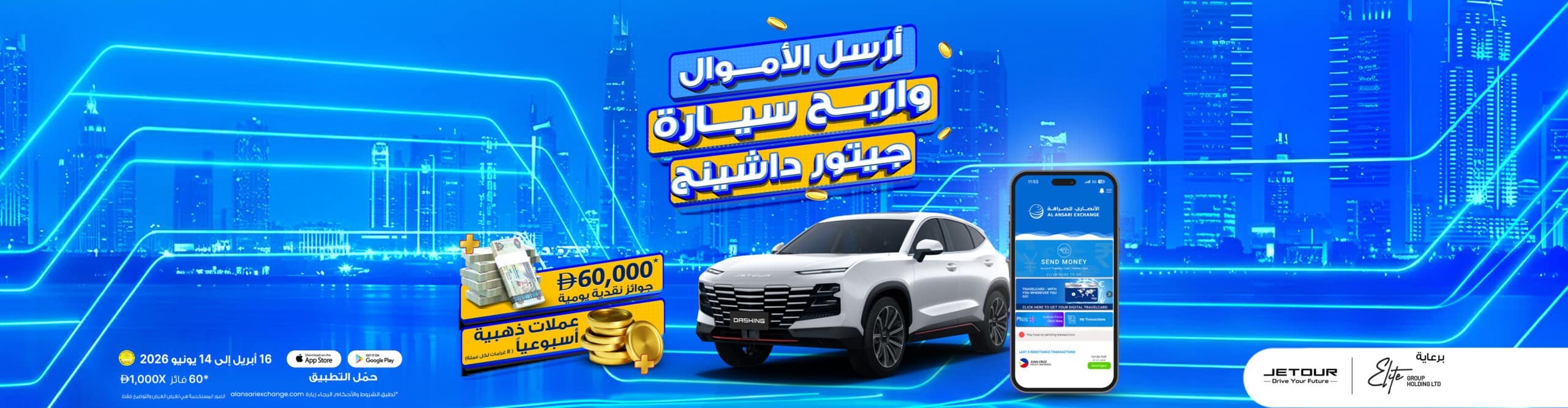 أرسل الأموال عبر تطبيق الأنصاري للصرافة وادخل السحب للفوز بسيارة جيتور داشينج، بالإضافة إلى عملات ذهبية أسبوعية (8 غرامات لكل عملة)، وجوائز نقدية يومية بقيمة 1,000 درهم.