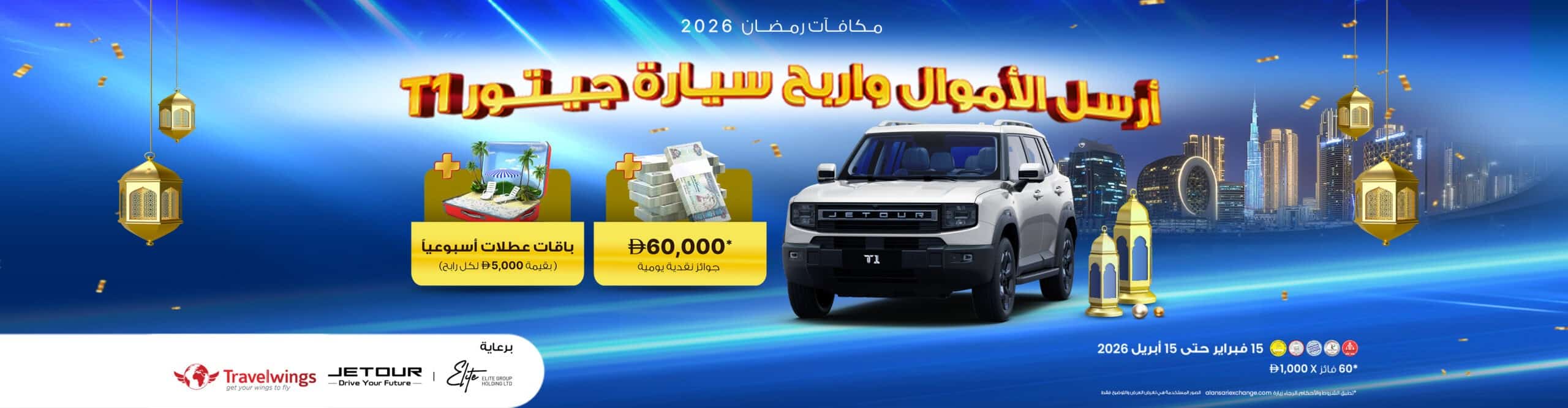 إنها فرصتك الآن لربح سيارة جيتور T1 بالإضافة إلى باقات عطلات مميزة من Travelwings أسبـوعياً و 1,000 درهم جائزة يومية.
