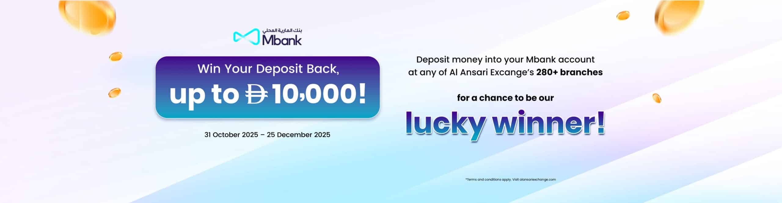 Make your next deposit to your Al Maryah Community Bank account even more rewarding. Deposit through any Al Ansari Exchange branch and get a chance to win up to AED 10,000 on your deposit amount.