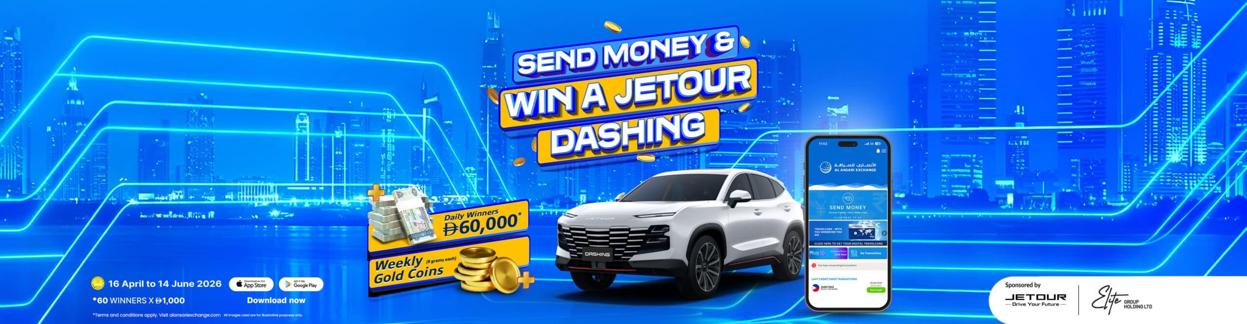 Send money through the Al Ansari Exchange App and enter the draw to win a Jetour Dashing, weekly gold coins (8 grams each), and AED 1,000 daily cash prizes.