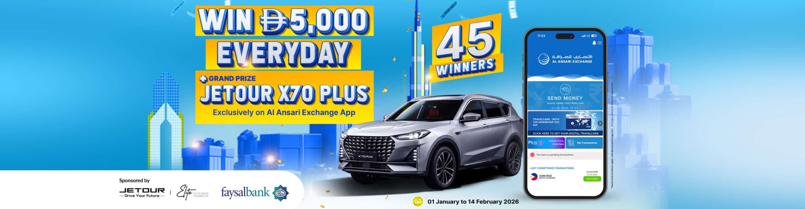 Send money through the Al Ansari Exchange App and get a chance to win AED 5,000 every single day, plus enter the grand prize draw for a Jetour X70 Plus