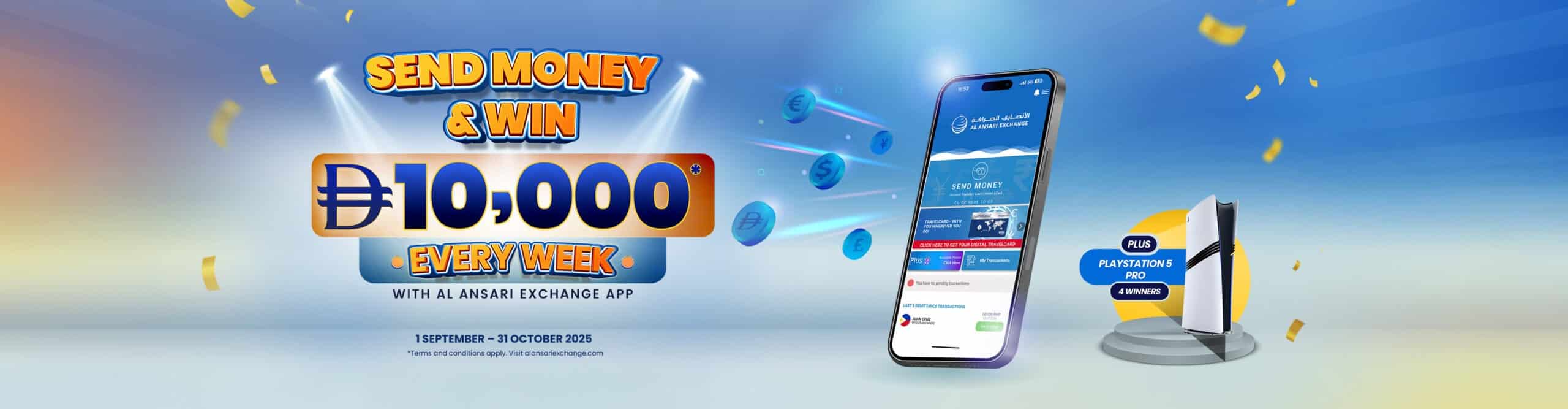 Now is your chance to win AED 10,000 weekly plus PlayStation 5 Pro when you send money using the Al Ansari Exchange app!