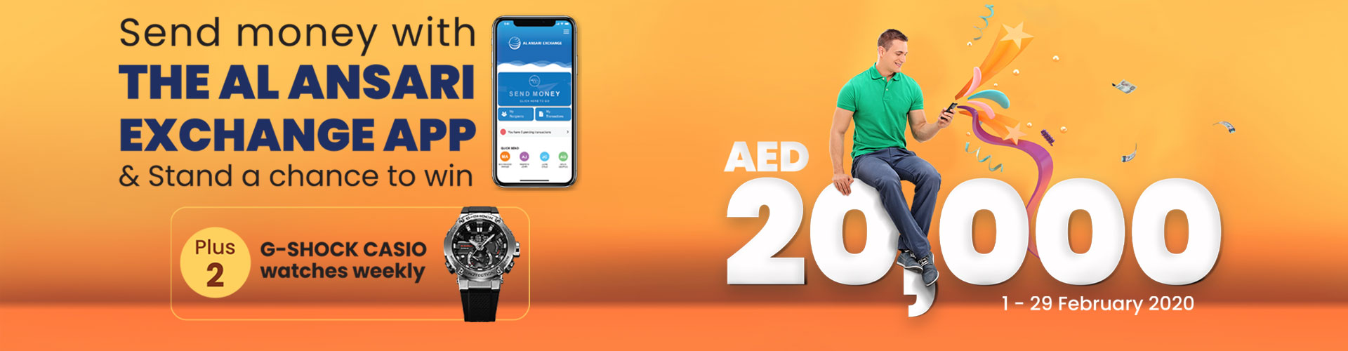 Send money exclusively through the Al Ansari Exchange mobile app and get the chance to win AED 20,000 in cash or one of two G-Shock Casio watches weekly.