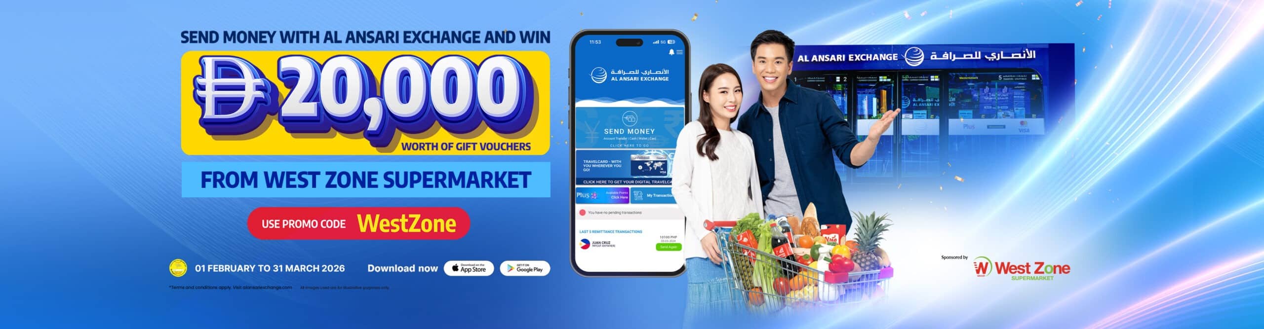 Send money through the Al Ansari Exchange App or at any of our branches for a chance to win AED 20,000 worth of shopping vouchers from West Zone Supermarket.