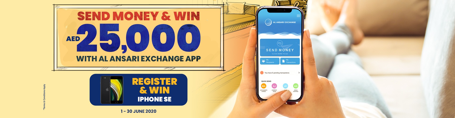 Send money through the Al Ansari Exchange mobile app & get a chance to win AED 25,000 in cash.